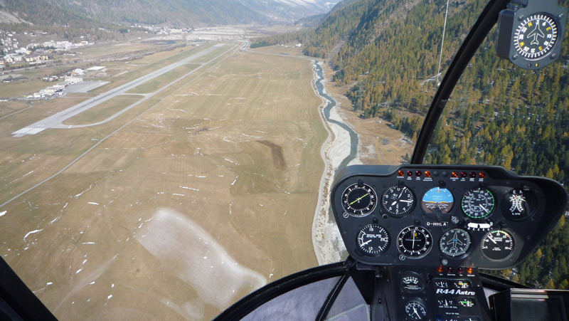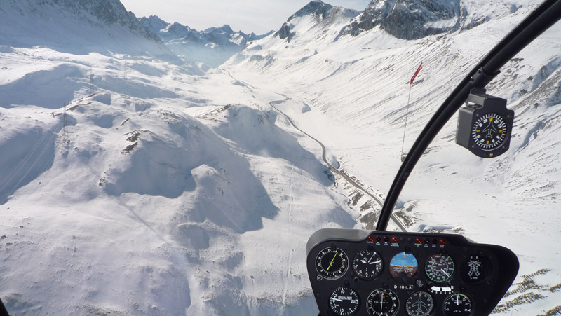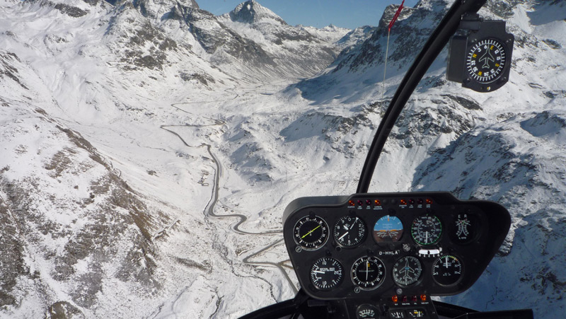 Nach der Betankung des Hubschraubers und Erledigen der Formalitäten für Zoll und Landegebühren, führt der Abflugweg, in einer Flughöhe von 8600ft über Meeresspiegel, über den Albulapass (7585ft MSL) nach Davos.